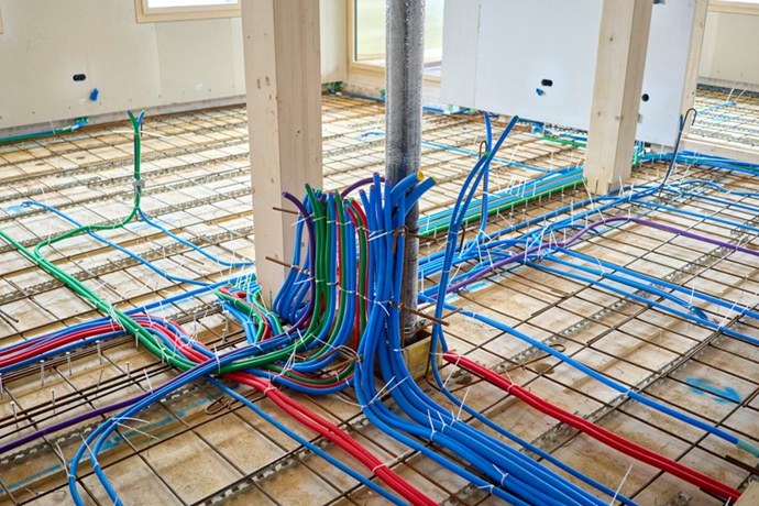 Trazado de ingeniería hídrica y climatización de Europa 9 previo al vertido de solera.